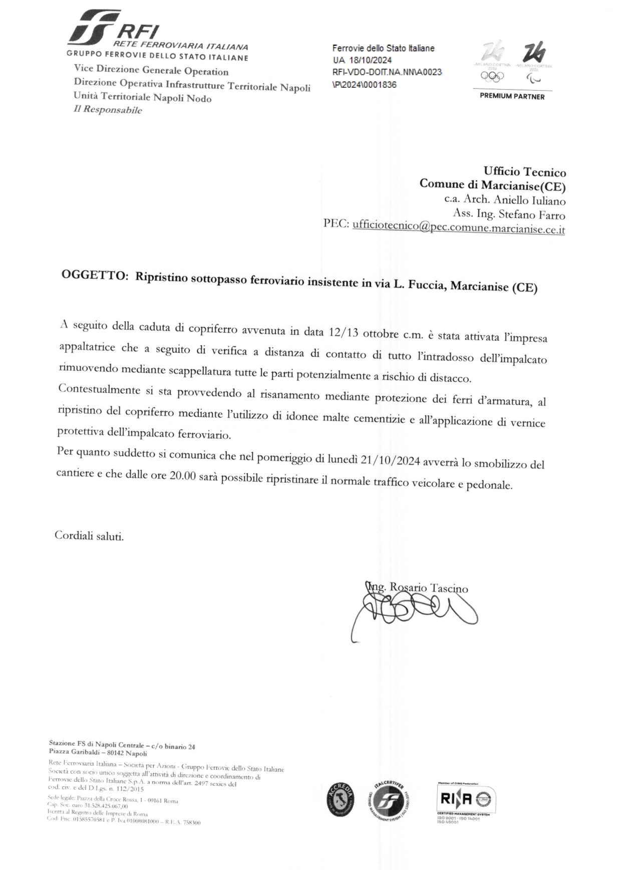 Rete Ferroviaria Italiana ha comunicato e confermato all’Ufficio Tecnico del Comune di Marcianise il completamento dell’intervento di manutenzione del sottopasso insistente in via Luigi Fuccia, interdetto al traffico veicolare e al passaggio pedonale da diversi giorni a causa della caduta di sezioni del copriferro della parte superiore della struttura, avvenuta il 12 e 13 ottobre.