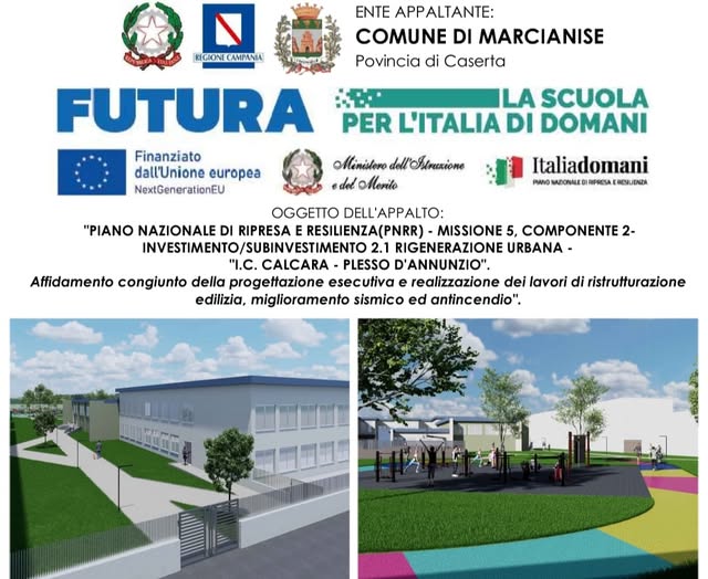 Lunedì 3 febbraio alle ore 12 si terrà la cerimonia di consegna del cantiere del I.C. CALCARA - PLESSO D'ANNUNZIO, in via Gabriele D'Annunzio 5, alla Ce.Mi., società aggiudicataria dell'appalto di ristrutturazione edilizia, miglioramento sismico e antincendio dell'edificio, intervento finanziato con fondi PNRR con un importo di 2,5 milioni di euro.