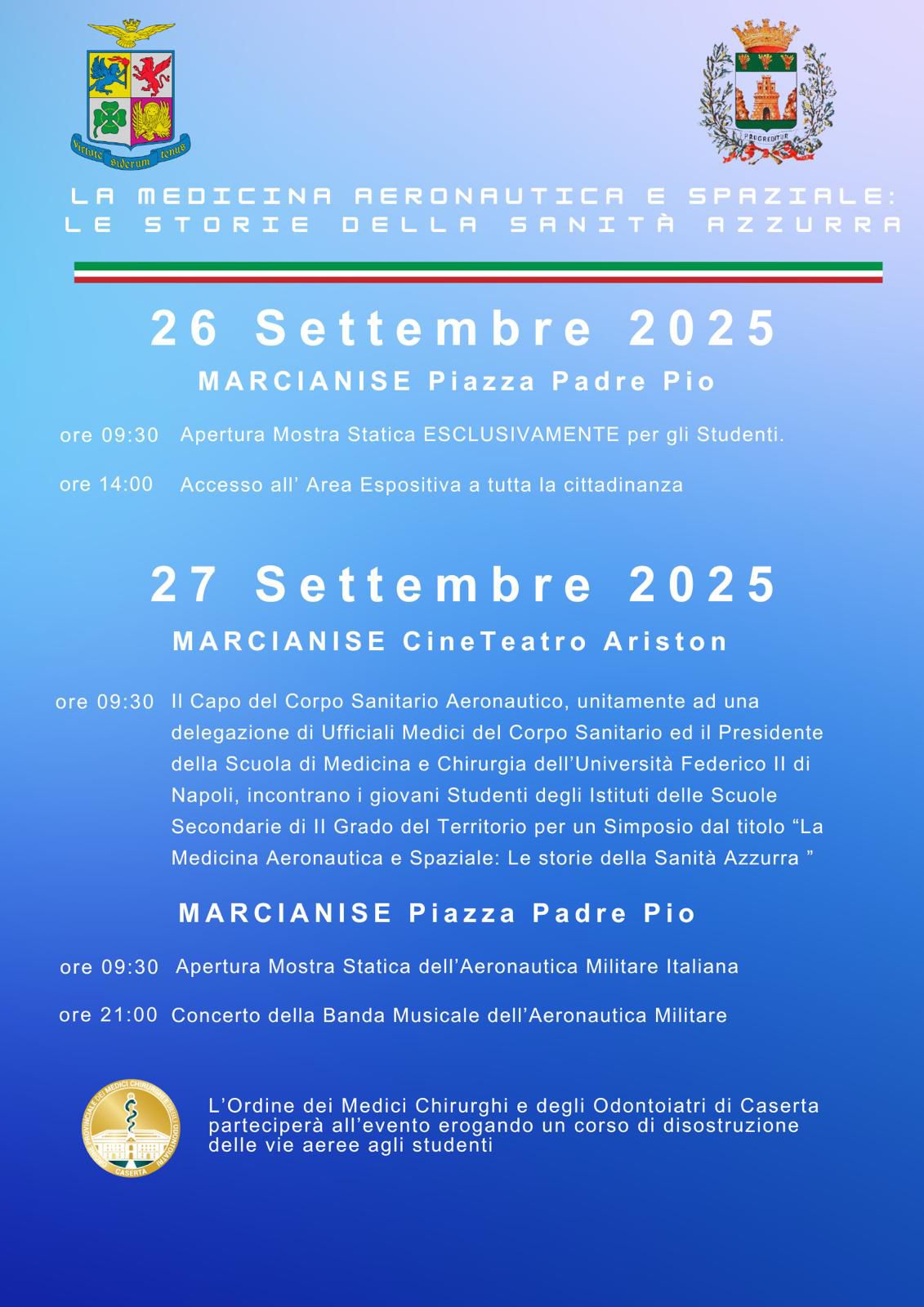 Marcianise si prepara a vivere due giornate indimenticabili, il 26 e 27 settembre 2025, che trasformeranno la città in un vero e proprio palcoscenico di cultura, formazione e spettacolo. L’iniziativa “La Medicina Aeronautica e Spaziale: le storie della Sanità Azzurra”, organizzata dall’Aeronautica Militare Italiana, rappresenta un’occasione straordinaria di incontro tra il mondo della scuola e quello delle istituzioni, offrendo agli studenti la possibilità di conoscere da vicino esperienze, professioni e valori legati al mondo militare e alla ricerca medica.