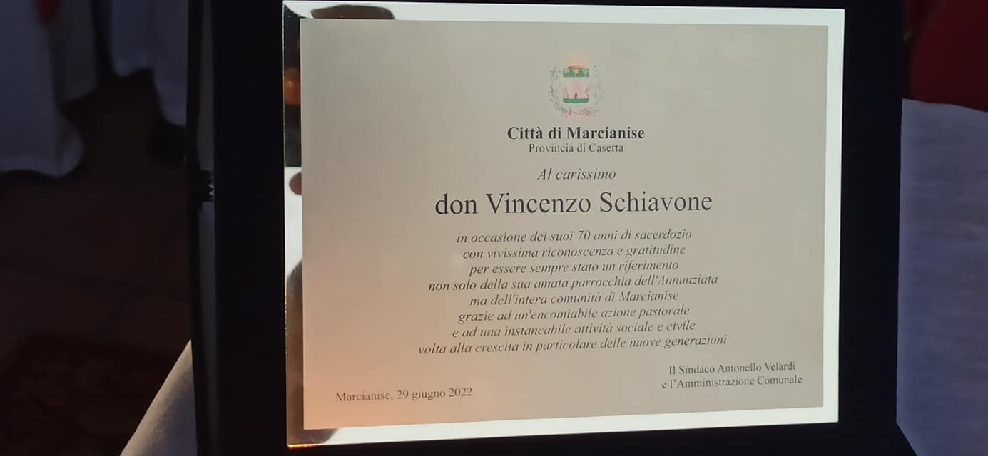 Mercoledì 29 giugno il sindaco Antonello Velardi ha partecipato alla cerimonia del 70esimo di sacerdozio di Don Vincenzo Schiavone, storico parroco della Chiesa della SS Annunziata di Marcianise, riferimento non solo per i fedeli ma per l'intera comunità cittadina.