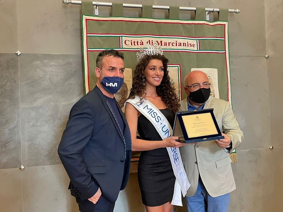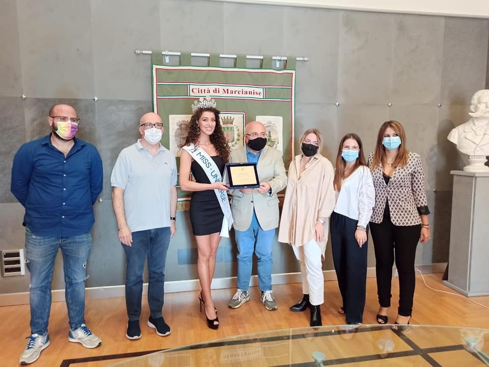 Una delegazione dell’Amministrazione, guidata dal sindaco Antonello Velardi, ha accolto nella sala giunta del Comune Caterina Di Fuccia, giovane 23enne marcianisana, reduce dalla vittoria di Miss Universo Italia, accompagnata dal direttore del concorso nazionale di bellezza Marco Ciriaci e da alcuni familiari.