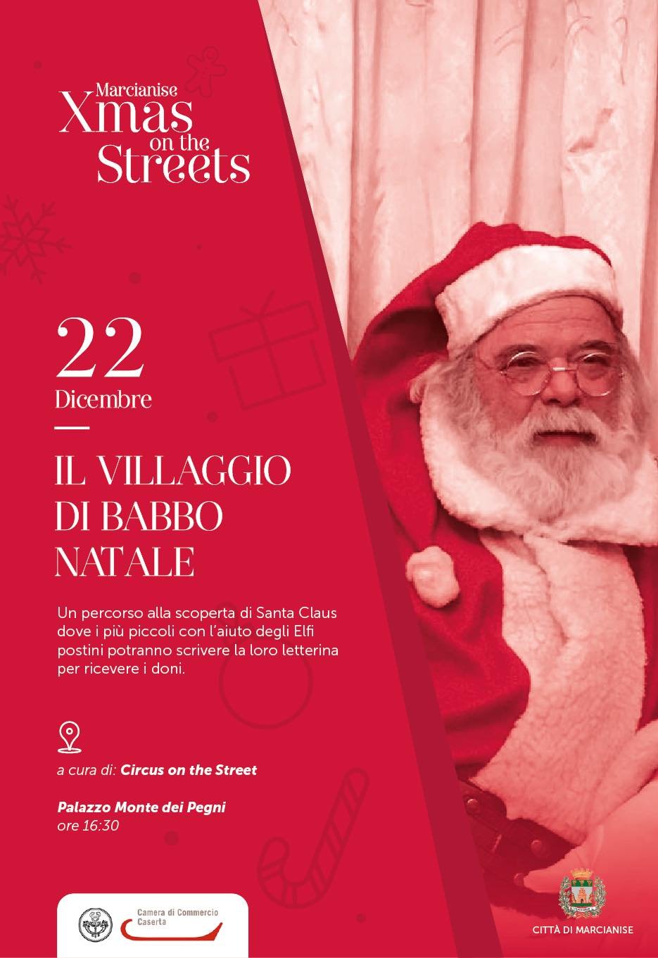 Mercoledì 22 dicembre dalle ore 16.30, presso il Palazzo ex Monte dei Pegni, l’associazione ‘Circus on the streets’, ha allestito il ‘Villaggio di Babbo Natale’, manifestazione promossa dall’Amministrazione comunale guidata dal sindaco Antonello Velardi nell’ambito della sesta edizione di ‘Xmas on the Streets’.