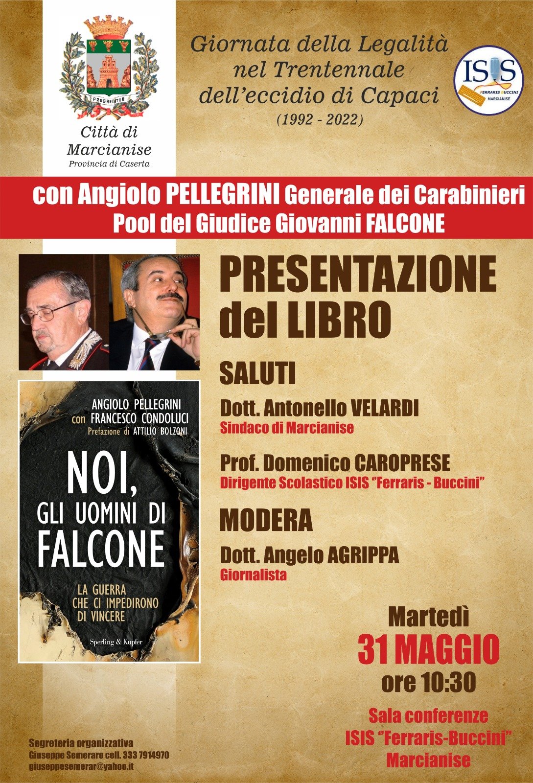 Questa mattina presso la sala conferenze dell’ISIS ‘Ferraris – Buccini’ il Generale dei Carabinieri Angiolo Pellegrini, componente del Pool Antimafia coordinato dal Giudice Giovanni Falcone, il magistrato ucciso nella strage di Capaci insieme alla moglie Francesca Morvillo e tre agenti della scorta, ha presentato il suo libro ‘Noi, gli uomini di Falcone’.