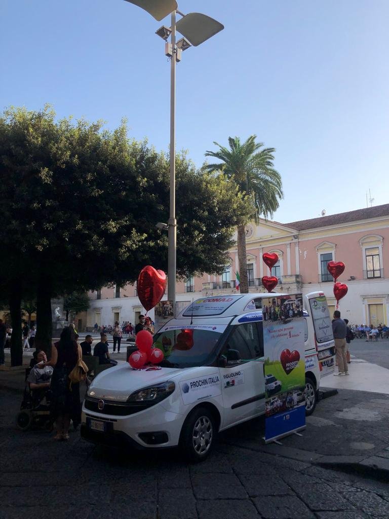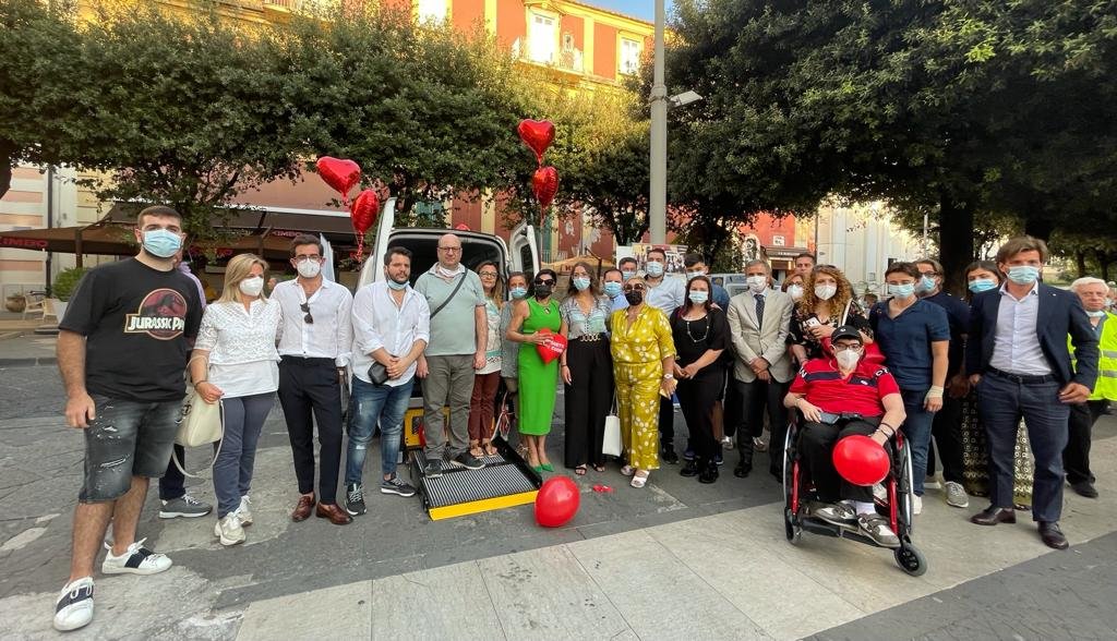 L’azienda ‘Progetti del cuore’ consegna le chiavi del pulmino al presidente dell’associazione di volontariato ‘Marcianise Soccorso’, che si occupa di offrire sostegno negli spostamenti alle persone affette da difficoltà motorie.