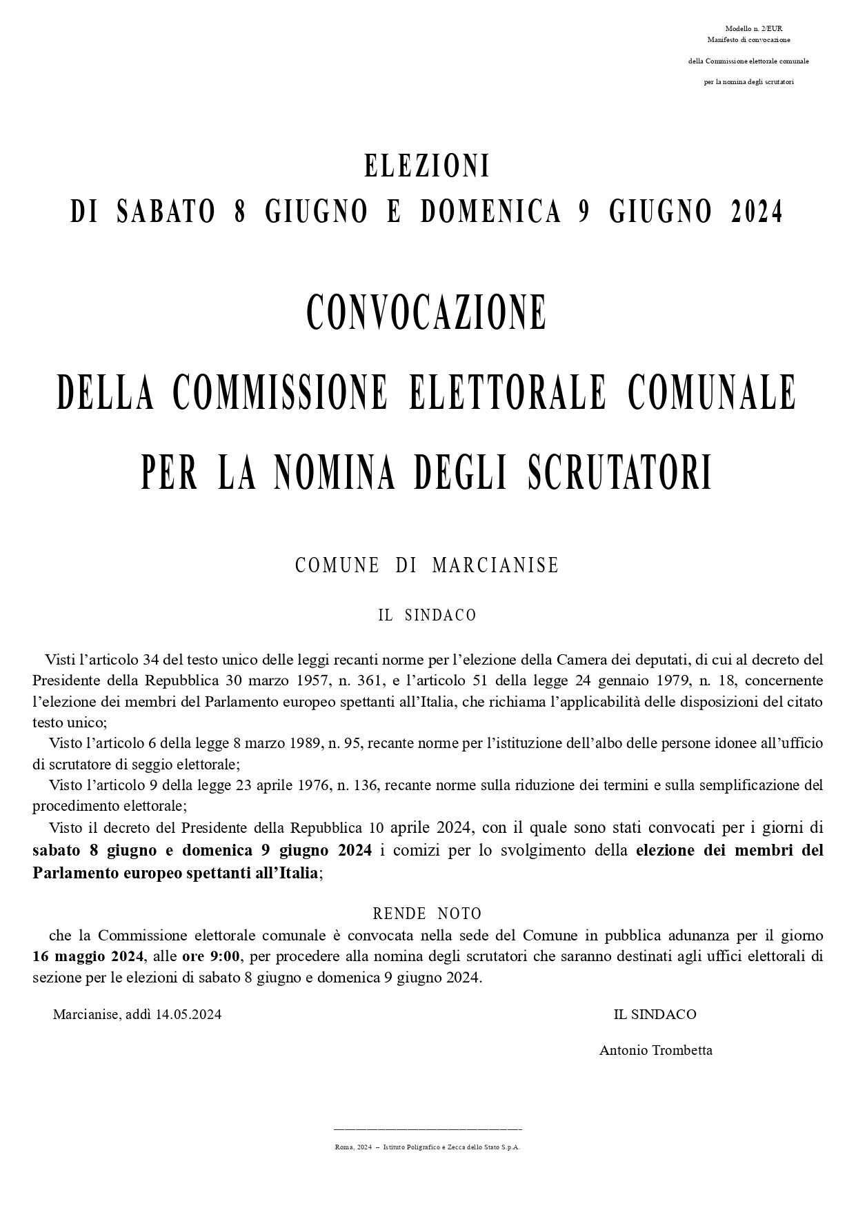 che la Commissione elettorale comunale è convocata nella sede del Comune in pubblica adunanza per il giorno 16 maggio 2024, alle ore 9:00, per procedere alla nomina degli scrutatori che saranno destinati agli uffici elettorali di sezione per le elezioni di sabato 8 giugno e domenica 9 giugno 2024.