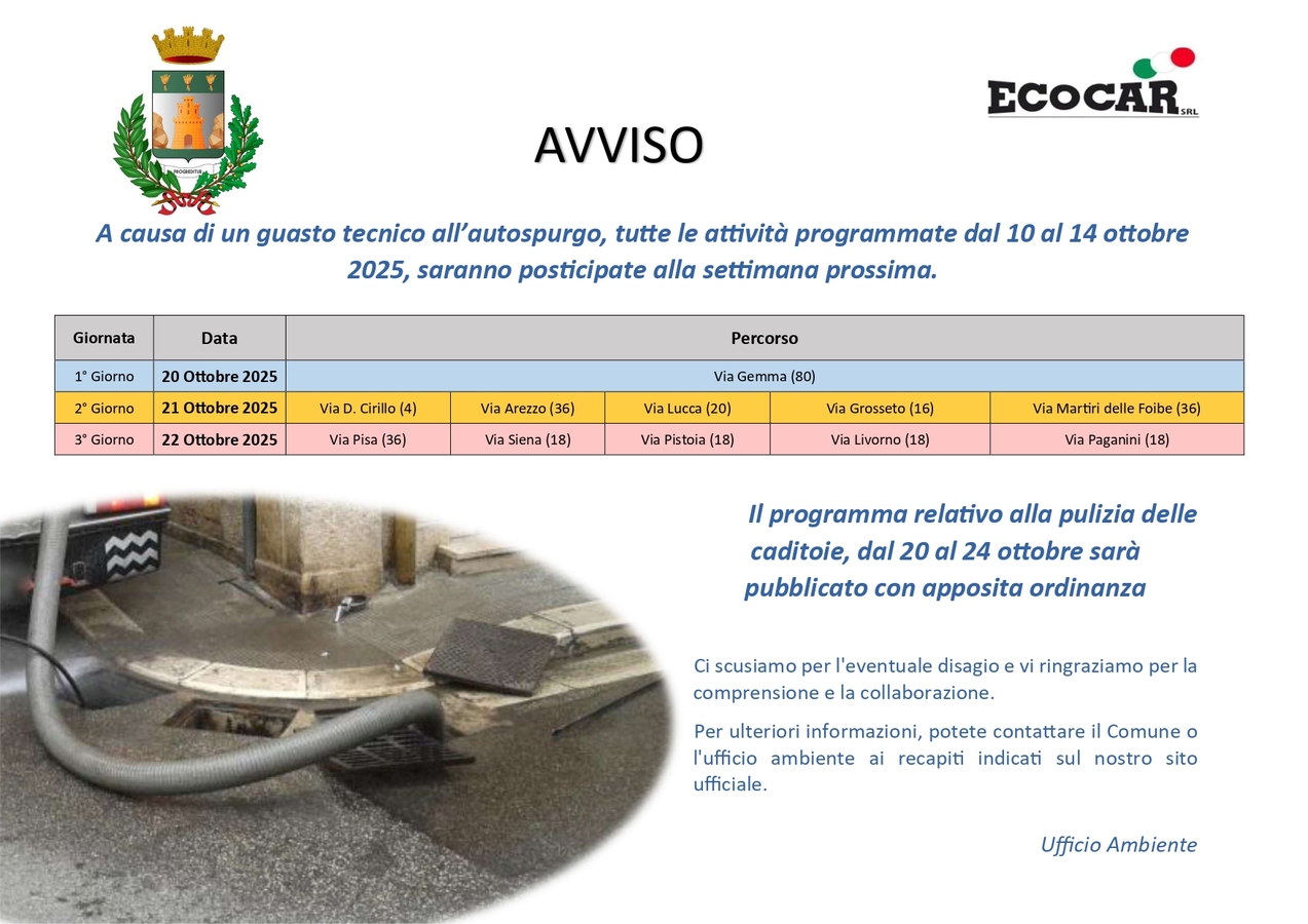 Si comunica alla cittadinanza che a causa di un guasto tecnico all’autospurgo, tutte le attività programmate dal 10 al 14 ottobre 2025, saranno posticipate alla settimana prossima.