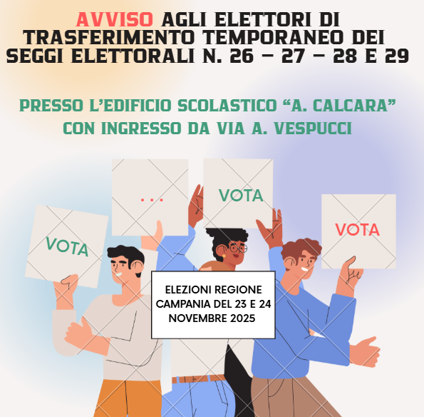 Si informa la cittadinanza che, in occasione delle Elezioni del Presidente e del Consiglio Regionale della Campania del 23 e 24 novembre 2025, le sezioni elettorali n. 26 – 27 – 28 – 29, normalmente ubicate presso l’edificio scolastico di via D’Annunzio, saranno temporaneamente trasferite presso l’edificio scolastico “A. Calcara” con ingresso da via A. Vespucci, a causa dei lavori di ristrutturazione in corso nella sede originaria.