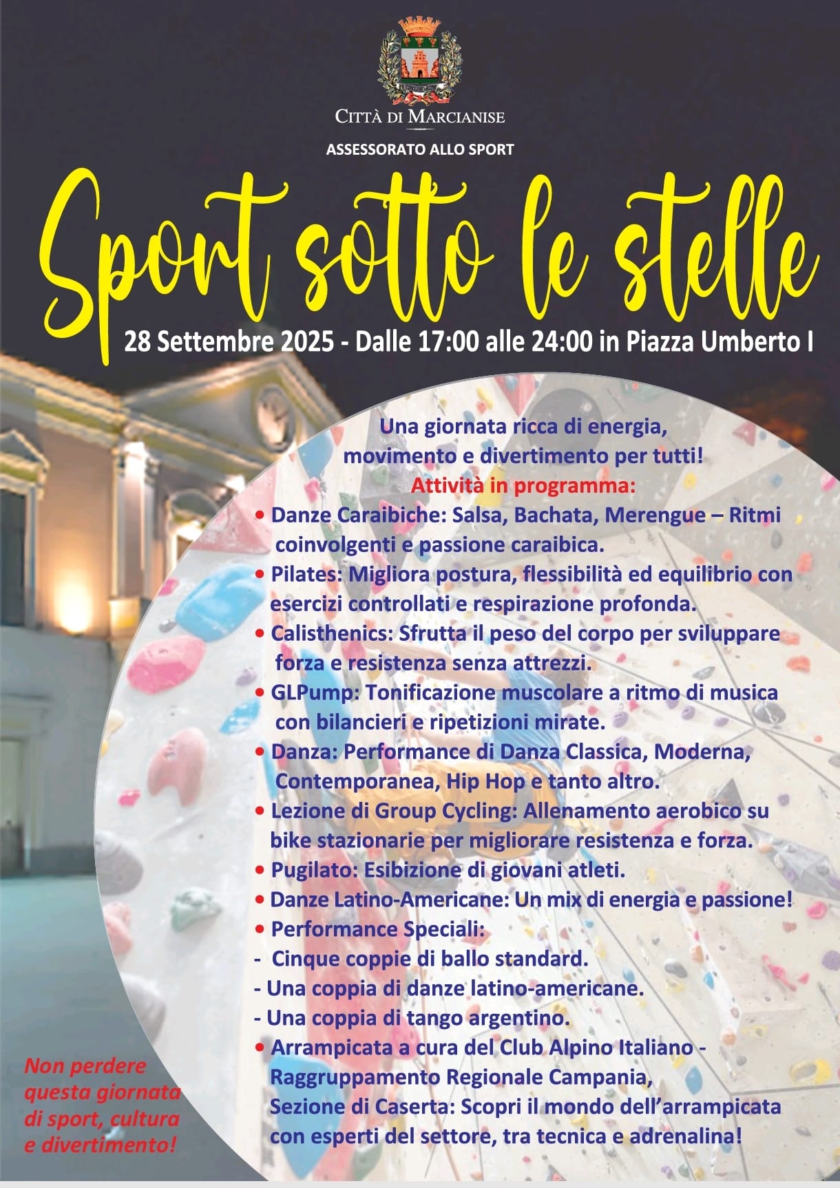 «Con “Sport sotto le Stelle” vogliamo lanciare il messaggio – spiega Mimmo Tartaglione, assessore allo sport – che lo sport è per tutti, per chiunque sia pronto a mettersi in gioco, senza distinzione di età o esperienza. Con questa manifestazione, il Comune di Marcianise offre una vetrina alle realtà sportive del territorio e intende sensibilizzare la cittadinanza verso una vita attiva, lontana dalla sedentarietà, e a scoprire il piacere del movimento».
