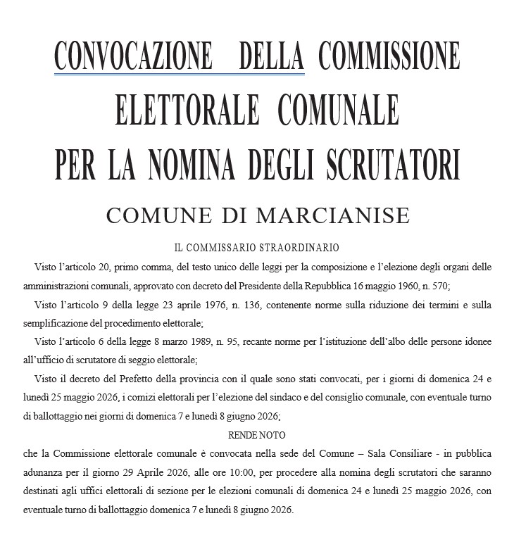 che la Commissione elettorale comunale è convocata nella sede del Comune – Sala Consiliare - in pubblica adunanza per il giorno 29 Aprile 2026, alle ore 10:00, per procedere alla nomina degli scrutatori che saranno destinati agli uffici elettorali di sezione per le elezioni comunali di domenica 24 e lunedì 25 maggio 2026, con eventuale turno di ballottaggio domenica 7 e lunedì 8 giugno 2026.