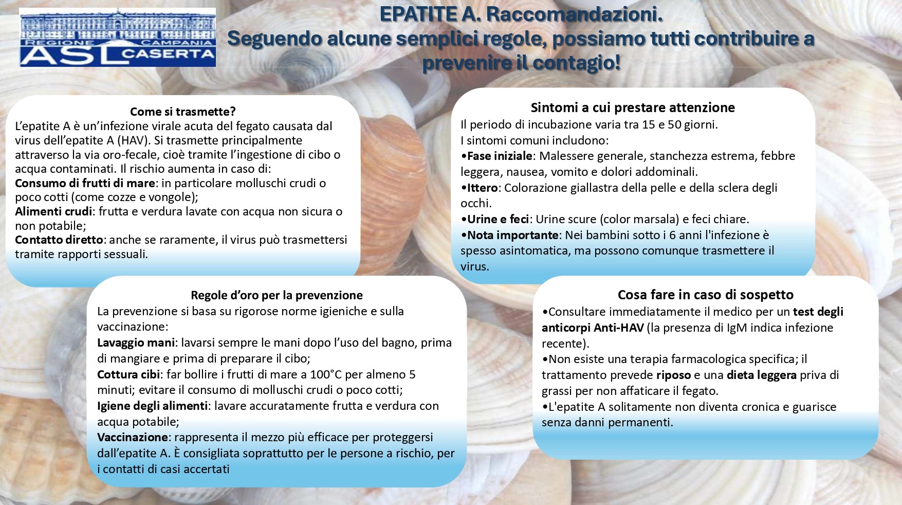 In relazione all’aumento dei casi di epatite A segnalati in Regione Campania nelle ultime ore, si riportano di seguito le raccomandazioni elaborate dalla ASL di Caserta volte a prevenire il contagio.
