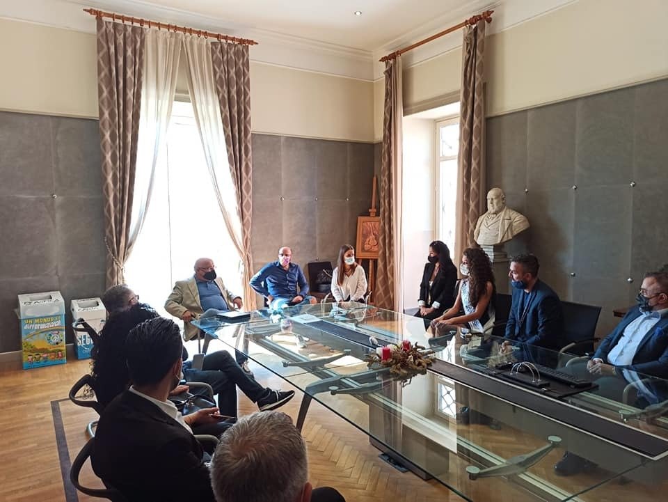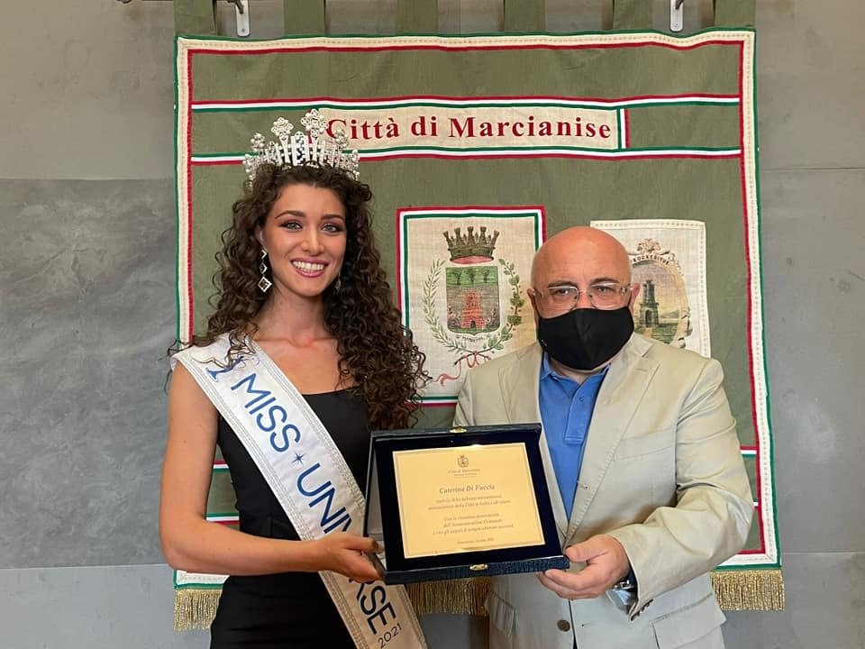 Una delegazione dell’Amministrazione, guidata dal sindaco Antonello Velardi, ha accolto nella sala giunta del Comune Caterina Di Fuccia, giovane 23enne marcianisana, reduce dalla vittoria di Miss Universo Italia, accompagnata dal direttore del concorso nazionale di bellezza Marco Ciriaci e da alcuni familiari.