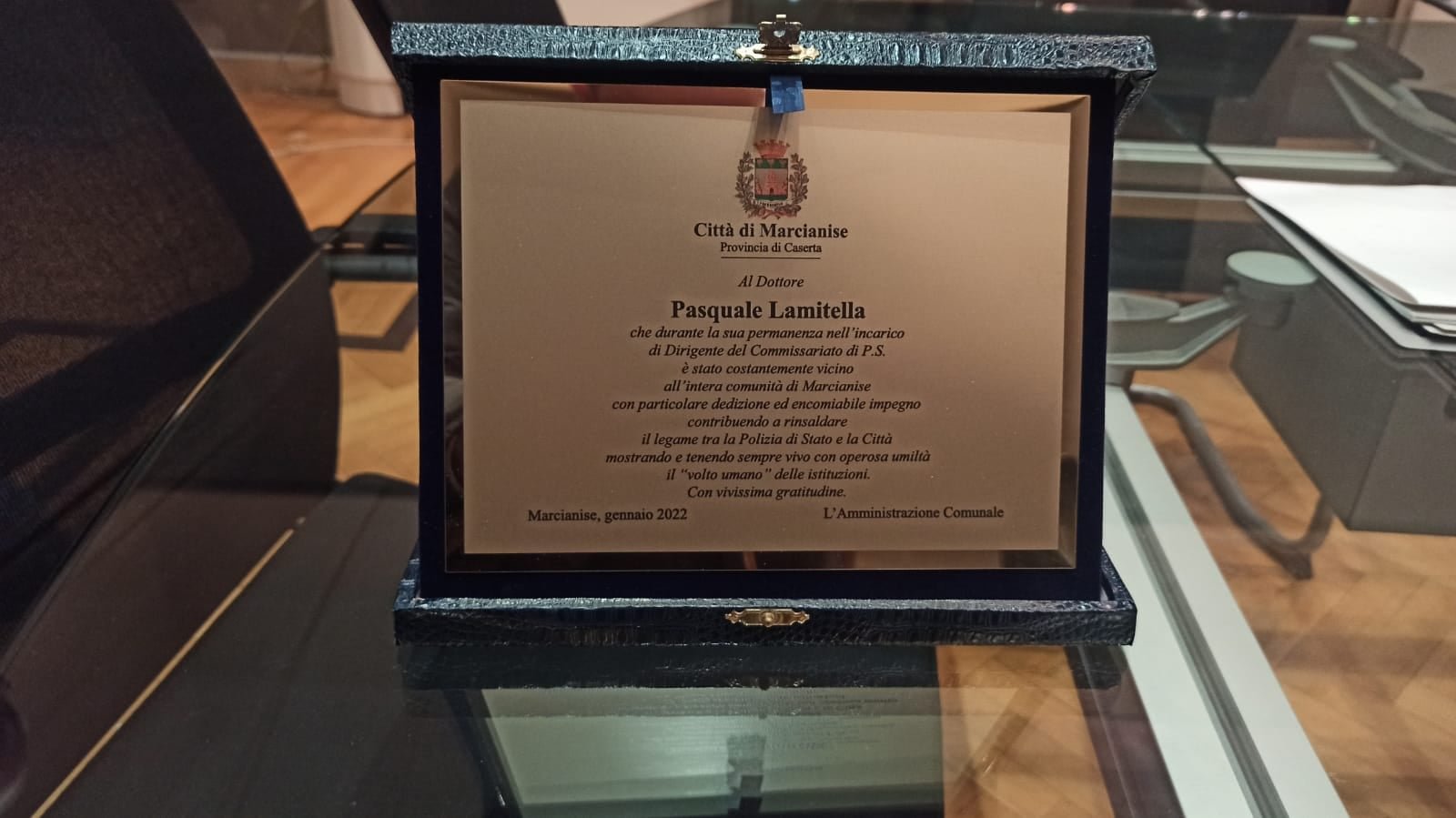 Il dottor Lamitella - che è rimasto a Marcianise per 16 mesi, proveniente dal Commissariato di Giugliano - ha a sua volta sottolineato il clima di forte collaborazione instauratosi con le istituzioni del territorio e ha voluto lasciare un messaggio di commiato nel libro d'onore custodito presso la stanza del Sindaco.