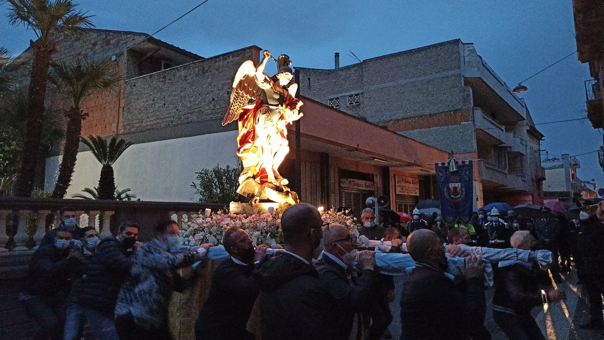Dopo due anni segnati dalla pandemia, questa sera, nonostante la pioggia, la statua del Santo Patrono San Michele Arcangelo è stata portata in processione da centinaia di fedeli, accompagnata dall'Amministrazione Comunale e dalle Congreghe.