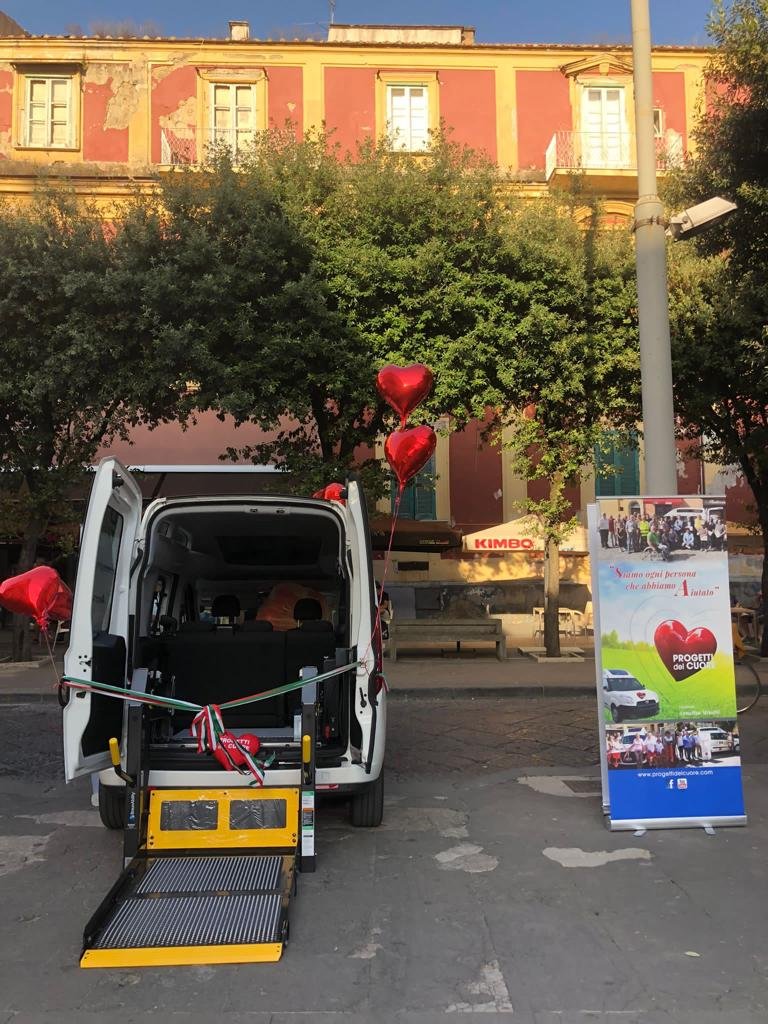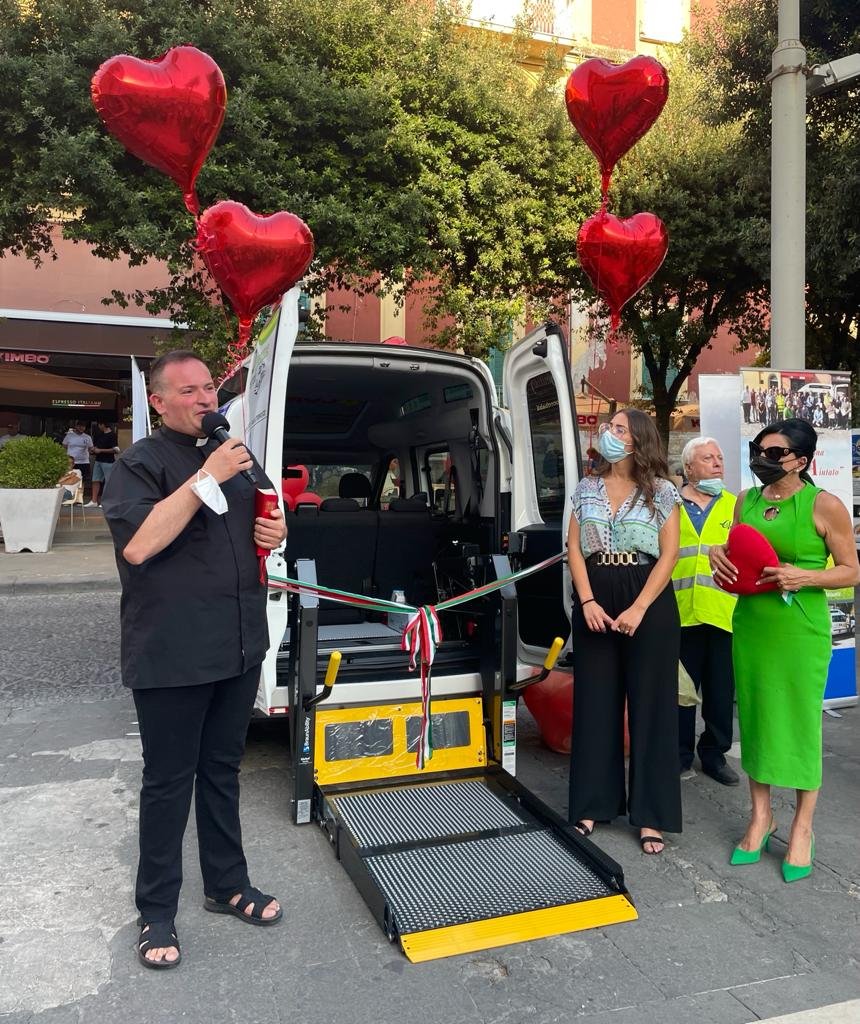 L’azienda ‘Progetti del cuore’ consegna le chiavi del pulmino al presidente dell’associazione di volontariato ‘Marcianise Soccorso’, che si occupa di offrire sostegno negli spostamenti alle persone affette da difficoltà motorie.